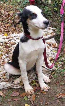 Dora, geboren im Juni 2025, ist ein kleines Mischlingsmädchen, die mittelgroß werden wird.